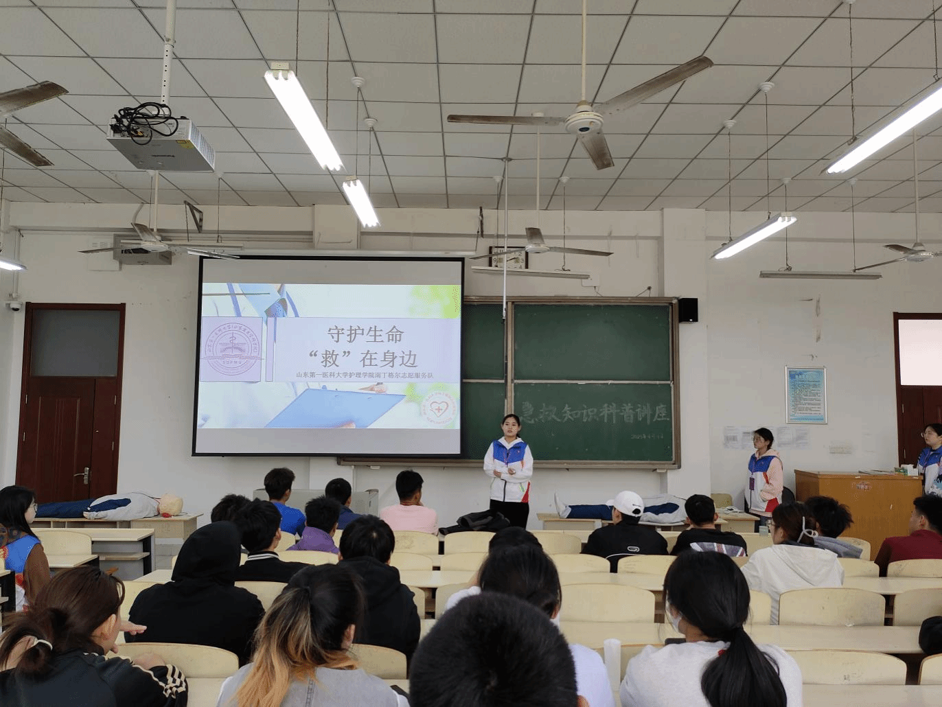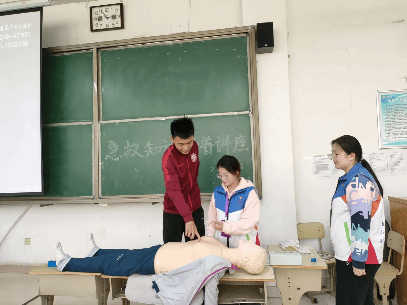 活动伊始,晁毓菡代表泰山公司向服务队表示诚挚欢迎。活动中,队员们运用医学专业知识,围绕心肺复苏要领、AED功能和使用方法等方面,以急救前、急救中和急救后三个阶段的准备工作、具体操作和注意事项作为讲解的重点,采用ppt讲解和现场模拟演示相结合的方法,对心肺复苏以及如何使用AED进行了生动的演绎。