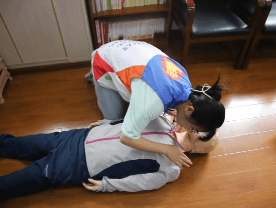 活动分为知识宣讲和实操展示两个环节。在第一个环节,队员们为社区居民详细讲解了单人成人心肺复苏操作方法、要领及注意事项,与他们进行提问互动,订正知识误区,解答相关问题。在第二个环节,两名队员分别在大厅演示了单人成人心肺复苏操作的完整过程,并鼓励在现场的社区居民积极参与实际操作演练,同时队员在旁悉心指导。现场居民积极参与,活动结束后,大家纷纷表示收获满满。