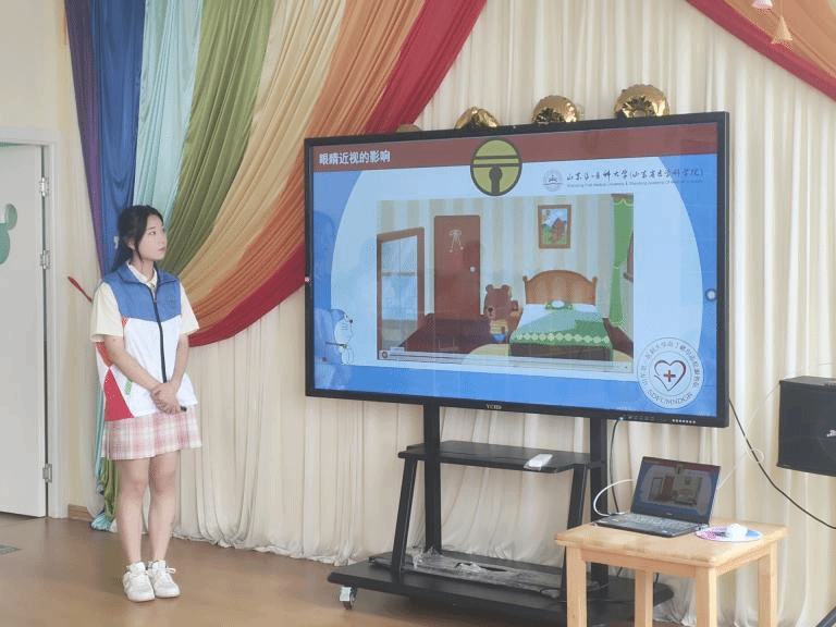 第一天活动主题为爱眼护眼教育。队员通过PPT讲解、视频播放等形式向孩子们介绍眼部问题的形成原因和危害,引导孩子们从小养成良好的用眼习惯,并结合实际生活教育,让幼儿在日常活动中注意用眼的卫生,增强爱眼护眼意识。队员还结合讲座知识进行互动提问,鼓励小朋友们积极回答问题,小朋友在问答互动中加深了对爱眼护眼知识的记忆。