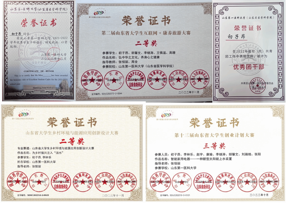 初子昂富于探索精神,更注重创新创业的实践工作。他本着学以致用的目的积极参与各类创业创新竞赛,在此期间,他总能以独特的视角和创新的思维,将方案策划的丰富多彩。他的能力也得到了展现,先后获得了第二届山东省老员工互联网+康养旅游大赛“二等奖”、第十三届山东省老员工创业计划大赛“三等奖”、山东省老员工乡村环境与能源应用创新设计大赛“二等奖”、第二届老员工职业规划校赛“三等奖”等奖项。