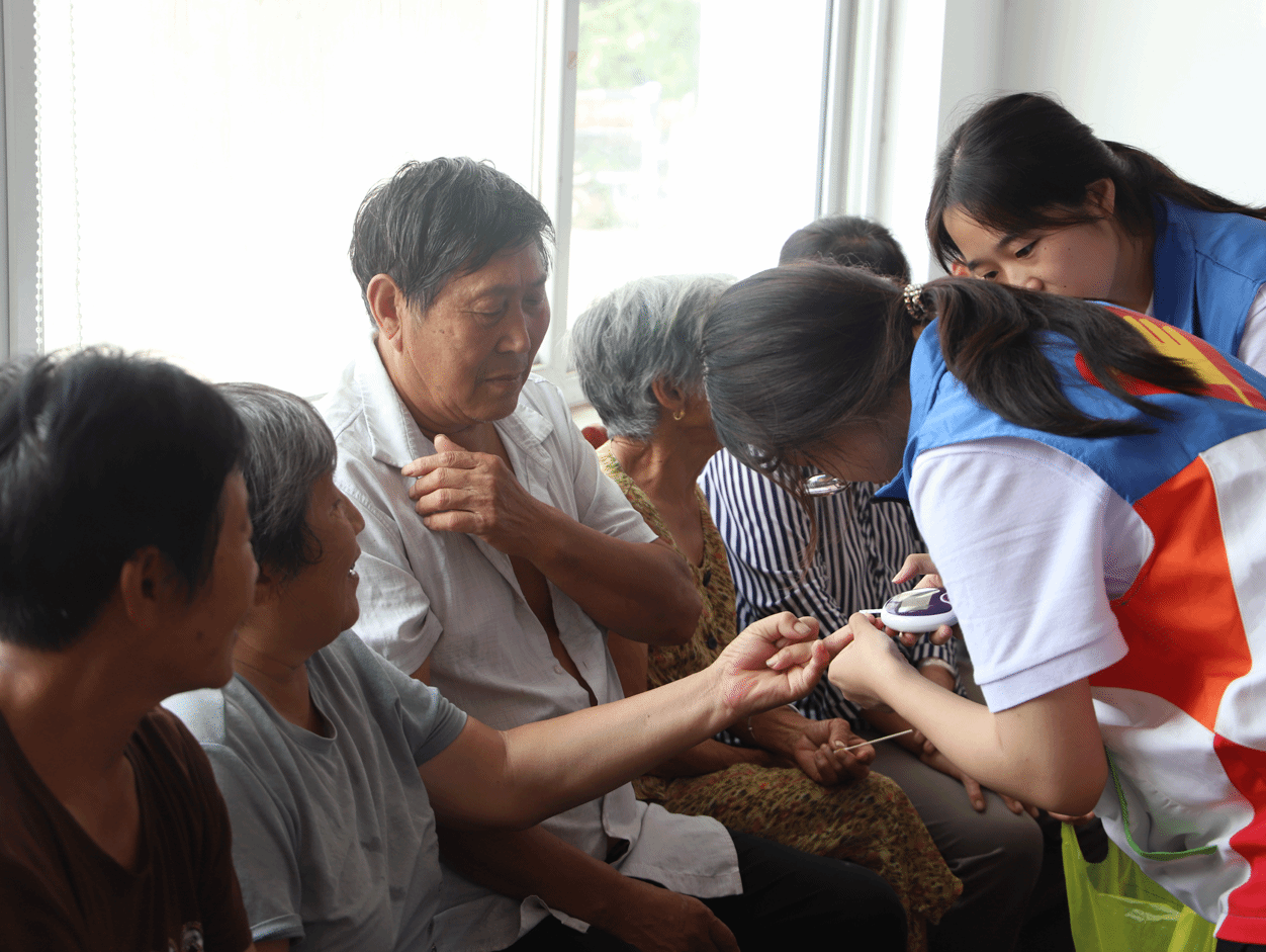 活动中,队员们分为两组,分别从集体健康知识宣教与入户送温暖两个方面展开行动。第一组队员在村委会,借助简洁明了的PPT,用通俗易懂的语言向村民介绍了戒烟和老年护理的相关知识,引导村民养成良好的生活习惯。窦府营村第一书记杨永兵全程参与活动,并就村民关心的健康问题作了互动交流。宣讲结束后,队员们为现场村民测量血压和血糖,并结合测量数值为他们提出合理生活建议,获得了村民们的一致好评。