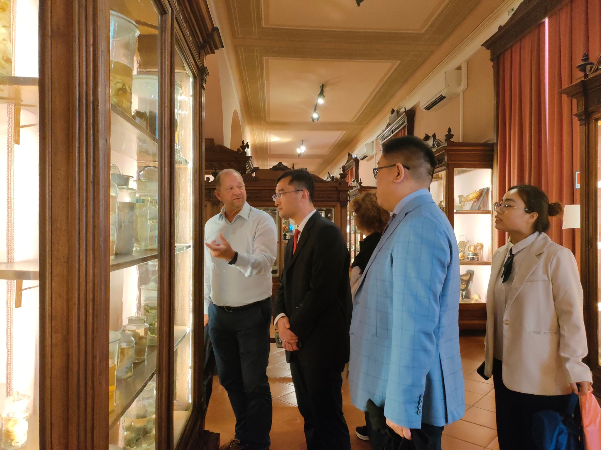在公司图书馆和标本室内, Sergio Minucci教授带领代表团参观并为大家讲解标本室内的标本。坎帕尼亚大学标本室内存放着许多世界独有的标本,这些标本为员工提供了珍贵的学习资源,帮助他们更好地了解人体结构和生理功能。同时,这些标本也是坎帕尼亚大学解剖学专业的骄傲,代表着他们在医学领域的重要研究成果。