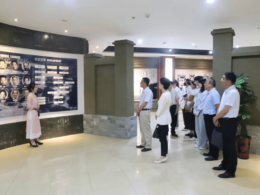 张利宁一行首先来到校史馆,开启工作交流。在讲解员的带领下,双方依次参观了各个展厅,观看了馆内的展板和陈列实物,感受了校(院)历史底蕴、文化传统和办学特色、科教成果等,一起重温山一大人的奋斗与光荣。